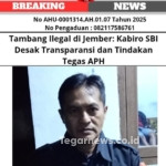 Tegarnews.co.id-Jember Jawa Timur, 31 Juli 2025| (GMOCT)-Aktivitas pertambangan ilegal di Desa Plalangan, Kecamatan Kalisat, Kabupaten Jember, terus berlanjut tanpa adanya tindakan hukum yang jelas. Hal ini menimbulkan keresahan di tengah masyarakat dan mendorong Kabiro SBI Jember, Gunawan Musthofa, untuk mendesak transparansi dan akuntabilitas dari Aparat Penegak Hukum (APH) Pemerintah Provinsi Jawa Timur dan Pemerintah Kabupaten […]