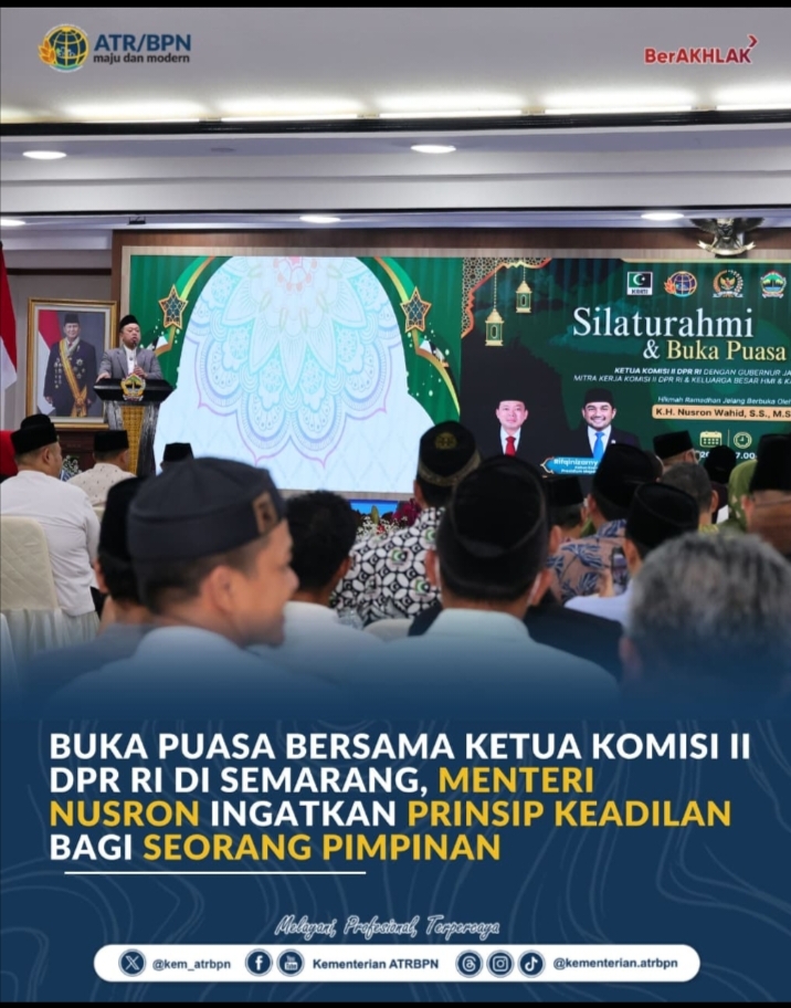 Tegarnews.co.id – Semarang, 9 Maret 2026 | Menteri Agraria dan Tata Ruang/Kepala Badan Pertanahan Nasional (ATR/BPN), Nusron Wahid, menekankan pentingnya prinsip keadilan bagi seorang pemimpin. Kepada pejabat negara yang hadir dalam acara Silaturahmi dan Buka Puasa Bersama Ketua Komisi II Dewan Perwakilan Rakyat Republik Indonesia (DPR RI) di Semarang, Jawa Tengah, Sabtu (07/03/2026), ia mengingatkan […]