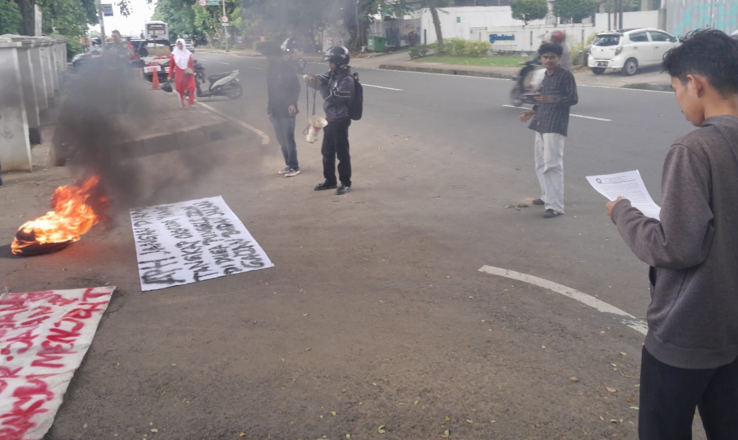 Sejak awal, massa menunjukkan sikap konfrontatif secara simbolik. Sebuah ban bekas dibakar tepat di depan pintu masuk kantor dinas. Asap hitam pekat membumbung tinggi, menutup sebagian akses gerbang dan menjadi gambaran kemarahan publik atas kinerja instansi yang dianggap gagal menjalankan tanggung jawabnya.