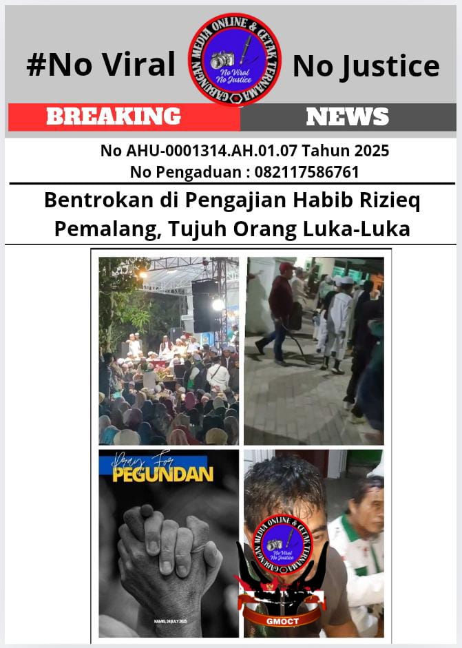 Tegarnews.co.id—Pemalang, Jawa Tengah, 24 Juli 2025| Peringatan bulan Muharam yang menghadirkan Habib Muhammad Rizieq Shihab (MRS) di Desa Pegundan, Kecamatan Petarukan, Kabupaten Pemalang, Jawa Tengah, berujung bentrokan pada Rabu (22/7/2025) malam. Insiden ini mengakibatkan tujuh orang luka-luka, termasuk dua anggota kepolisian. Informasi ini diperoleh GMOCT (Gabungan Media Online dan Cetak Ternama) dari Detikperistiwa, media online anggota GMOCT.