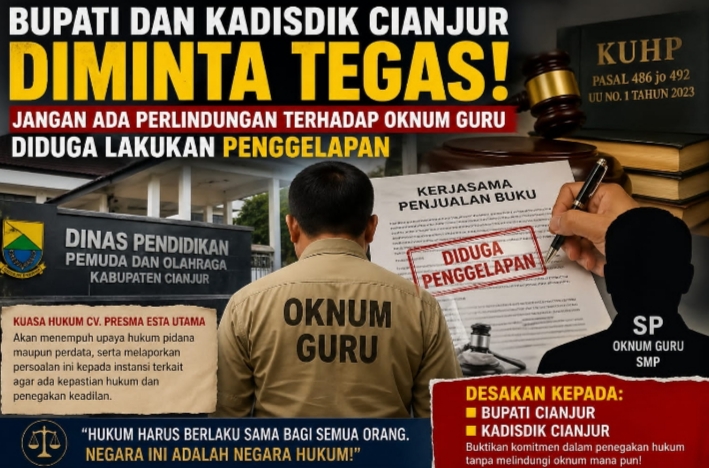 Tegarnews.co.id – Cianjur, 29 April 2026 | Kuasa Hukum CV. Presma Esta Utama menyoroti belum adanya penyelesaian atas dugaan perbuatan melawan hukum yang dilakukan oknum guru SMP berinisial SP, yang berada di bawah naungan Dinas Pendidikan Pemuda dan Olahraga Kabupaten Cianjur.