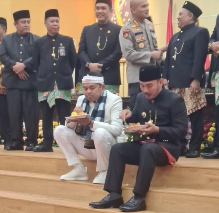 Tegarnews.co.id-Bekasi, 15 Agustus 2025| Gubernur Dedi Mulyadi usai diberikan sepiring nasi tumpeng dari Bupati Bekasi Ade Kuswara Kunang lalu dirinya bergerak ke depan dan duduk dengan santai menyantap potongan tumpeng tersebut.