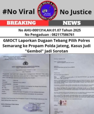 Tegarnews.co.id-Semarang, 24 September 2025 (GMOCT)| Gabungan Media Online dan Cetak Ternama (GMOCT) secara resmi melaporkan dugaan praktik tebang pilih dalam penegakan hukum kasus perjudian oleh Polres Semarang ke Propam Polda Jawa Tengah. Pelaporan ini dilakukan pada Selasa, 23 September 2025, oleh Sekretaris Umum GMOCT, Asep NS, didampingi Ketua DPD GMOCT Provinsi Jawa Tengah, M Bakara, […]