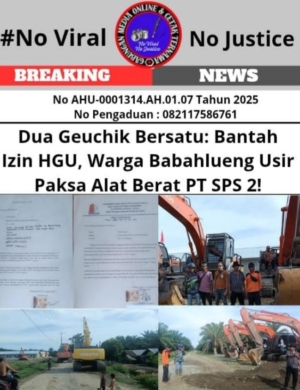 Tegarnews.co.id-Nagan Raya, 27 September 2025 (GMOCT)| Gelombang penolakan terhadap praktik mafia tanah kembali menggema di Nagan Raya. Warga Desa Babahlueng, berbekal pernyataan tegas dari dua Geuchik—mantan dan yang sedang menjabat—bersatu padu mengusir alat berat milik PT Surya Panen Subur (SPS) 2 dari lahan yang disengketakan. Aksi heroik ini merupakan puncak kekesalan warga atas klaim perusahaan […]