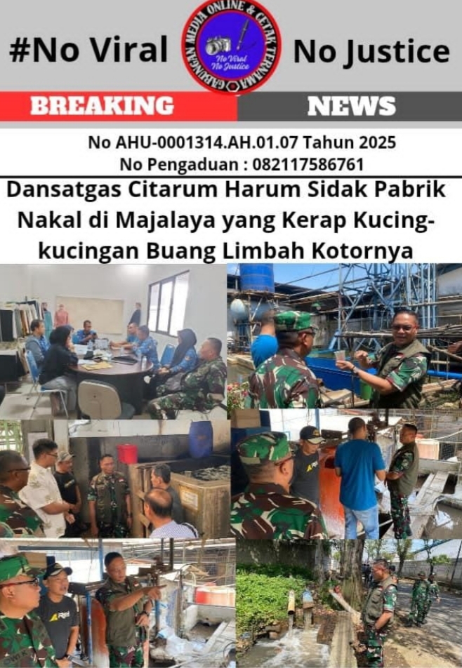 Tegarnews.co.id-Kabupaten Bandung, 11 November 2025| GMOCT (Gabungan Media Online dan Cetak Ternama). Komandan Satuan Tugas (Dansatgas) Citarum Harum, Kol. Inf. Yanto Kusno Hendarto, S.H., bersama Komandan Sektor 1 Citarum Harum, Kol. Inf. Kristianto, S.E., melakukan inspeksi mendadak (sidak) ke sejumlah pabrik di Majalaya pada Senin, 10 November 2025, bertepatan dengan Hari Pahlawan. Sidak ini dilakukan menyusul laporan warga terkait pembuangan limbah berwarna hitam ke aliran anak Sungai Citarum. Informasi ini diperoleh GMOCT dari media online Sinarsuryanews.com.