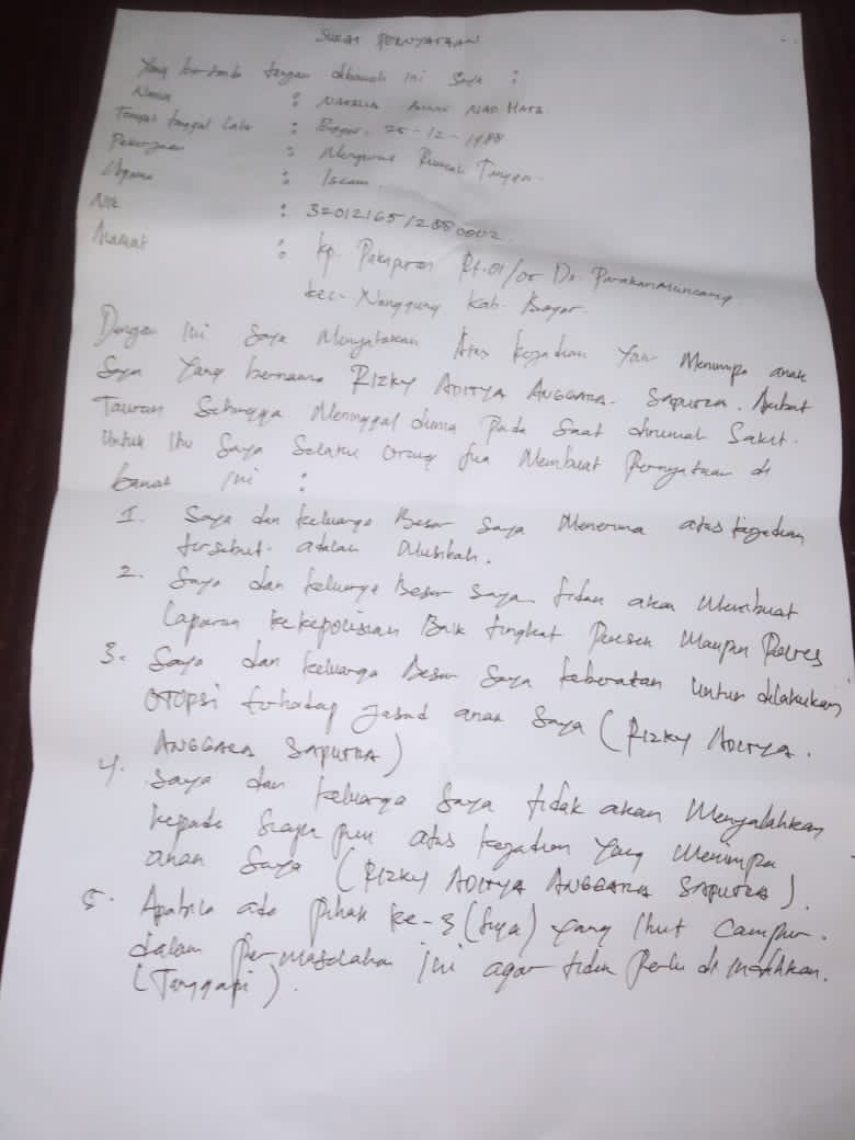 Pasalnya dugaan intimidasi yang dilakukan oleh oknum anggota Polsek Cibungbulang Polres Bogor ini kerap menyalakan kode etik (SOP), Adanya pemberian surat pernyataan Perdamaian secara sepihak yang dilakukan oleh Polsek Cibungbulang Polres Bogor kepada keluarga korban yang saat itu dalam keadaan tertekan dan sedang berduka.