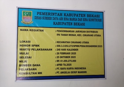 Berdasarkan data resmi LPSE Kabupaten Bekasi, proyek tersebut bernama Pengembangan Jaringan Distribusi IPA Tanah Merah Kecamatan Cikarang Utara. Proyek ini berada di bawah tanggung jawab Dinas Sumber Daya Air, Bina Marga, dan Bina Konstruksi Kabupaten Bekasi dengan tahun anggaran 2025, pagu Rp61.856.900.000, dan volume pekerjaan sepanjang 26.210,55 meter. Kontraktor pelaksana tercatat PT Rafa Karya Indonesia.