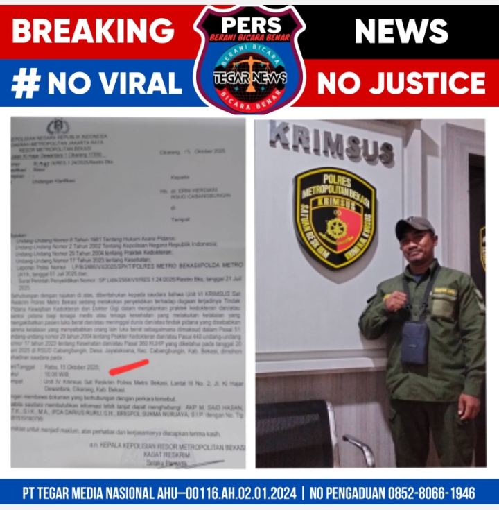 Tegarnews.co.id – Kabupaten Bekasi, 16 Oktober 2025- Kasus dugaan malpraktik yang menyeret nama Rumah Sakit Umum Daerah (RSUD) Cabangbungin, Kabupaten Bekasi, terus menuai sorotan publik. Unit Kriminal Khusus (Krimsus) Polres Metro Bekasi kini tengah mendalami laporan masyarakat atas dugaan kelalaian medis yang menyebabkan kehilangan bola mata pada salah satu pasien dan kematian pasien lainnya.