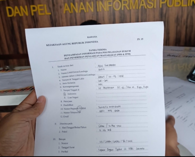 Laporan dengan nomor 012/LAPDU/GAGAK/III/2026 tersebut diserahkan langsung oleh Sekretaris Jenderal GAGAK, Agus Suryaman, di Gedung Bundar Kejaksaan Agung. Penyerahan laporan ini diperkuat dengan bukti Tanda Terima Penyampaian Informasi pada Pos Pelayanan Hukum tertanggal 10 Maret 2026 pukul 15.06 WIB.