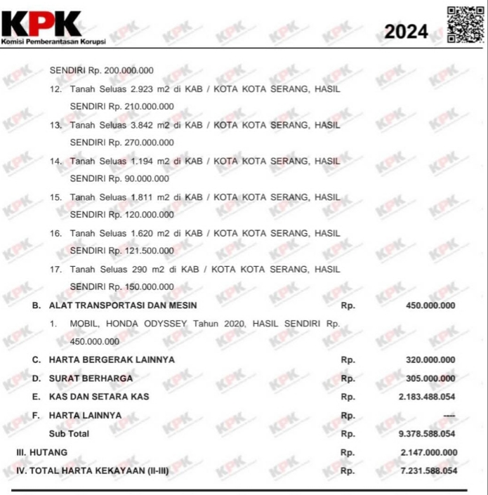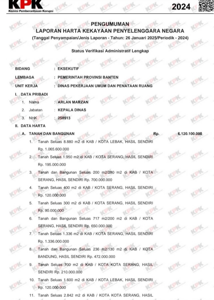 Berdasarkan penelusuran dokumen LHKPN 2024, Arlan masih tercatat memiliki tanah dan bangunan di wilayah Tangerang Selatan dan Serang senilai Rp5,8 miliar, alat transportasi sekitar Rp750 juta, serta kas dan setara kas Rp600 juta.
