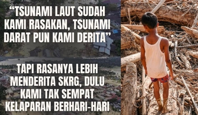 “Tsunami laut sudah kami rasakan, tsunami darat pun kami derita. Tapi rasanya lebih menderita sekarang, dulu kami tak sempat kelaparan berhari-hari.” Meme berisi keluh-kesah korban bencana semacam ini menyebar di berbagai platform media sosial.