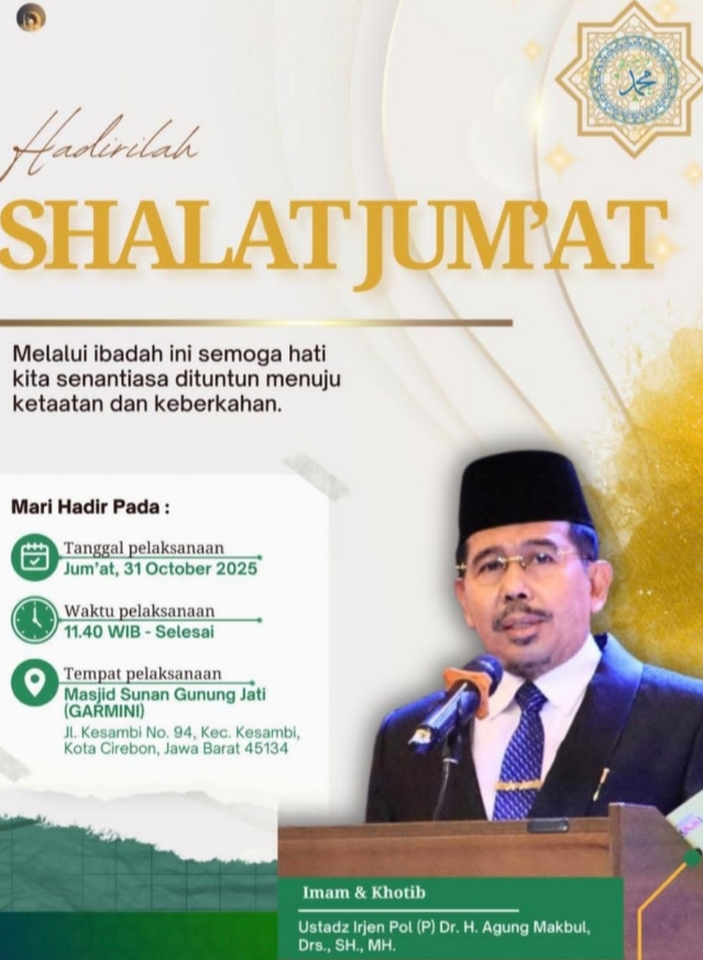 Tegarnews.co.id-Jakarta, 31 Oktober 2025| Purnawirawan Inspektur Jenderal Polisi Dr. H. Agung Makbul, Drs., SH., MH., menyampaikan pesan reflektif tentang pentingnya menjadikan hari Jumat sebagai waktu untuk bermuhasabah dan memperdalam hubungan spiritual dengan Allah SWT. Dalam pesannya, Agung Makbul menegaskan bahwa Jumat bukan sekadar hari penutup pekan, tetapi momentum untuk introspeksi dan menata kembali arah kehidupan dengan nilai-nilai moral dan keimanan.