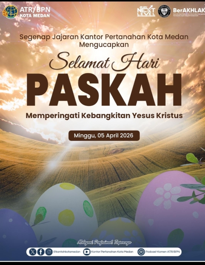 Tegarnews.co.id – Medan, 6 April 2026 | Kantor Pertanahan Kota Medan menyampaikan ucapan Selamat Hari Paskah kepada seluruh umat Kristiani, khususnya di wilayah Kota Medan dan sekitarnya. Momentum Hari Paskah ini menjadi waktu yang penuh makna untuk memperingati kebangkitan Yesus Kristus, yang membawa pesan harapan, kasih, dan pembaruan bagi kehidupan umat manusia.