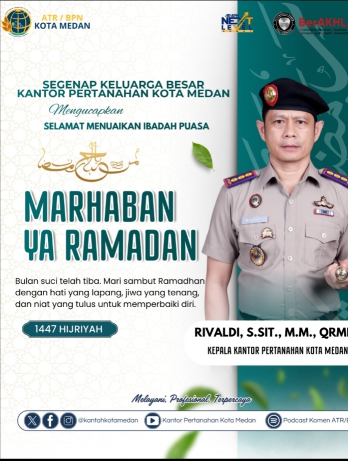 Tegarnews.co.id-Medan, 19 Februari 2026| Kantor Pertanahan Kota Medan menyampaikan ucapan Selamat Menunaikan Ibadah Puasa Ramadan 1447 Hijriah kepada seluruh masyarakat Muslim, khususnya di Kota Medan. Ucapan ini disampaikan sebagai bentuk perhatian dan kepedulian institusi terhadap momen keagamaan yang penuh makna bagi umat Islam.