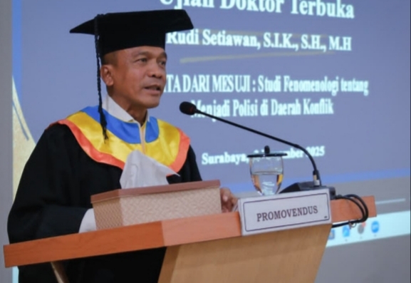 Tegarnews.co.id-Bandung, 4 Nopember 2025| Kapolda Jabar, Irjen Rudi Setiawan menjalani sidang disertasi berjudul ‘Cerita dari Mesuji: Studi Fenomeno logi tentang Menjadi Polisi di Daerah Konflik’ di Universitas Airlangga, (3/11).