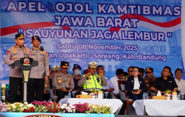 Tegarnews.co.id-Jawa Barat, 8 November 2025| Kapolri Jenderal Listyo Sigit Prabowo memimpin apel ojek online (ojol) kamtibmas ‘Sauyunan Jaga Lembur’ Polda Jawa Barat di Lapangan Upakarti, Soreang, Kabupaten Bandung, Jawa Barat (Jabar), Sabtu, 8 November 2025. Kegiatan ini merupakan sinergisitas untuk saling menjaga keamanan di lingkungan masyarakat.