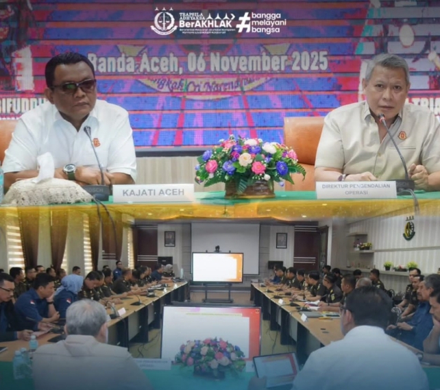 Dalam sambutannya, Kepala Kejaksaan Tinggi Aceh, menyampaikan apresiasi atas kehadiran tim dari Direktorat Pengendalian Operasi JAMPIDSUS. “Kegiatan ini menjadi momentum penting untuk memperkuat komitmen bersama dalam penegakan hukum yang profesional, akuntabel, dan berintegritas, sekaligus memastikan percepatan realisasi anggaran sesuai target,” ujarnya.