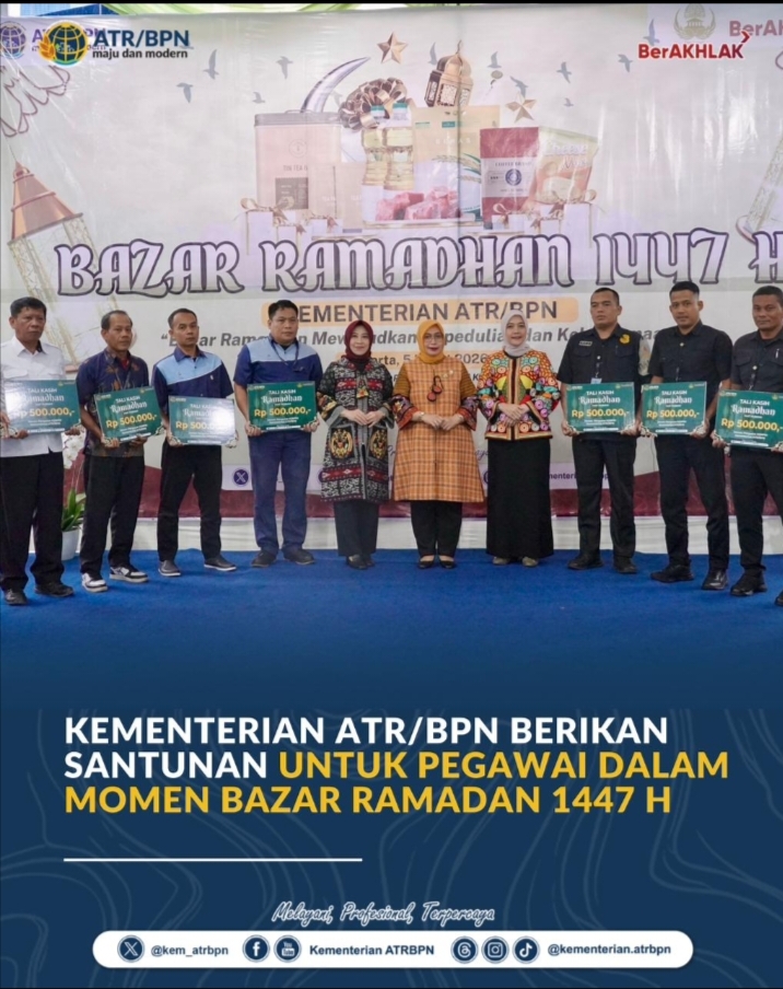 Tegarnews.co.id – Jakarta, 7 Maret 2026 | Di momen Ramadan, Kementerian Agraria dan Tata Ruang/Badan Pertanahan Nasional (ATR/BPN) menyalurkan santunan dan bingkisan kepada perwakilan keluarga Kementerian ATR/BPN yang terdiri dari Aparatur Sipil Negara (ASN), pramubakti, satpam, dan pengemudi di Kementerian ATR/BPN. Aang (45), salah satu satpam ATR/BPN yang berkesempatan menerima santunan dalam momen Bazar Ramadan 1447 H ini mengaku sangat bersyukur atas kepedulian Kementerian ATR/BPN terhadap pegawainya.