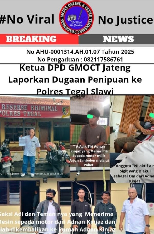 Tegarnews.co.id-Slawi Kabupaten Tegal, 12 November 2025| Ketua DPD Gabungan Media Online dan Cetak Ternama (GMOCT) Provinsi Jawa Tengah, M. Bakara, resmi membuat laporan polisi (LP) di Polres Tegal Slawi pada Senin, 10 November 2025. Laporan ini terkait dugaan tindak pidana penipuan yang dialami oleh Arjun Simbolon, yang telah memberikan surat kuasa kepada M. Bakara.