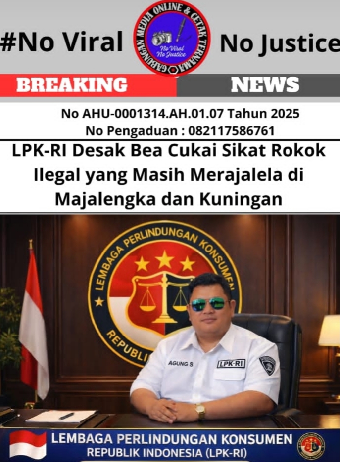 Tegarnews.co.id-Jawa Barat, 16 Februari 2026| Ketua II DPP Lembaga Perlindungan Konsumen Republik Indonesia (LPK-RI), Agung Sulistio, menerima laporan dari masyarakat Kabupaten Majalengka dan Kabupaten Kuningan, Jawa Barat, terkait masih maraknya peredaran rokok ilegal di wilayah tersebut. Informasi itu menyebutkan bahwa rokok tanpa pita cukai resmi masih dengan mudah ditemukan di sejumlah warung dan toko eceran.