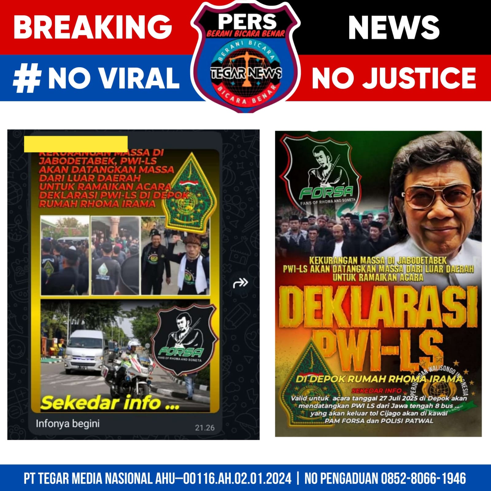 Tegarnews.co.id–Jakarta, 25 Juli 2025| Beredar pembahasan di grup whatapps diduga penyanyi Rhoma Irama mendalangi kasus kekerasan saat acara Tabligh Akbar yang dihadiri oleh Habib Rizieq Syihab (HBS) di Pemalang, Jawa Tengah, Rabu (23/07/2025).