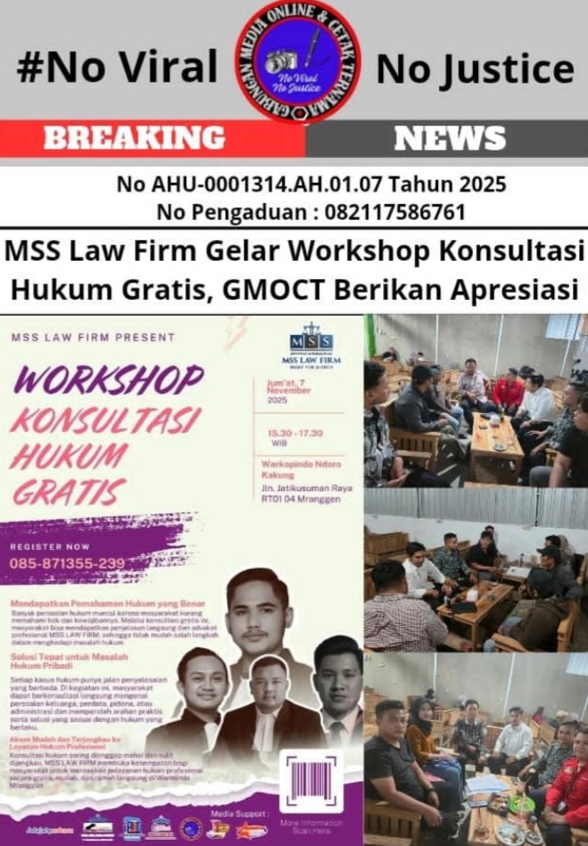 Tegarnews.co.id-Mranggen, 8 November 2025 (GMOCT)| MSS Law Firm sukses menggelar Workshop Konsultasi Hukum Gratis yang berlangsung di Warkopindo Ndoro Kakung, Jl. Jatikusuman Raya RT 01 RW 04, Mranggen. Kegiatan yang dilaksanakan pada Jumat sore 7 November 2025 pukul 15.30–17.30 WIB ini mendapat sambutan hangat dan antusiasme tinggi dari masyarakat setempat.