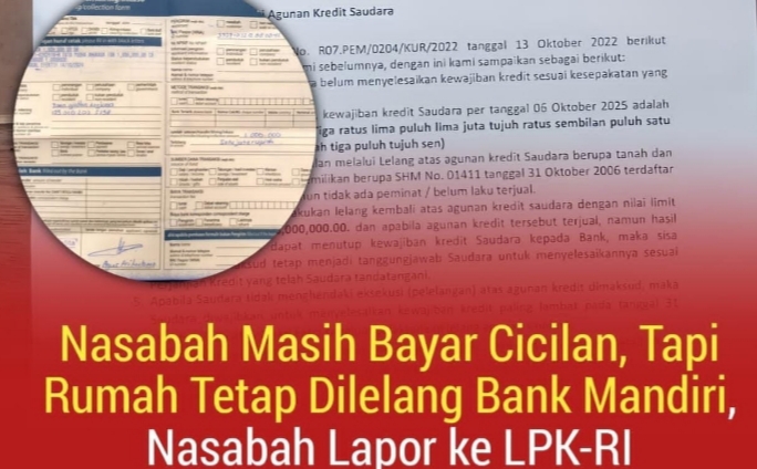 Berdasarkan dokumen yang diterima LPK-RI, Bank Mandiri menerbitkan surat bernomor SAM.RCR/RAM VII.01000923/2025 tertanggal 6 Oktober 2025, yang menyatakan bahwa agunan rumah akan dilelang dengan nilai limit Rp418 juta. Dalam surat itu disebutkan sisa kewajiban kredit sebesar Rp355,7 juta dan batas waktu pelunasan hingga 31 Oktober 2025. Namun, adanya bukti pembayaran rutin membuat keputusan lelang tersebut disoal oleh pihak nasabah.