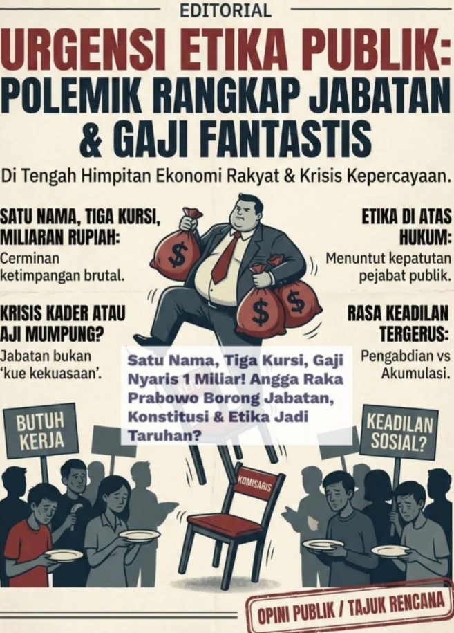 Tegarnews.co.id-Jakarta, 2 Februari 2026| Fenomena rangkap jabatan yang kembali menyeruak ke permukaan publik bukan sekadar isu administratif semata. Ketika satu nama memegang tiga posisi strategis sekaligus dengan akumulasi gaji yang menyentuh angka miliaran rupiah, hal ini mengirimkan sinyal yang meresahkan di tengah kondisi ekonomi masyarakat yang sedang tidak menentu.