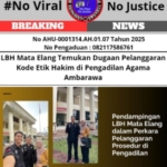 Tegarnews.co.id-Ambarawa, Jawa Tengah, 16 Mei 2025| (GMOCT). Lembaga Bantuan Hukum (LBH) Mata Elang melaporkan temuan dugaan pelanggaran prosedur persidangan dan kode etik hakim di Pengadilan Agama Ambarawa, Jawa Tengah. Laporan ini berdasarkan pendampingan hukum yang diberikan LBH Mata Elang kepada seorang warga, yang dalam artikel ini disebut sebagai “Pihak E,” terkait perkara cerai talak dengan […]