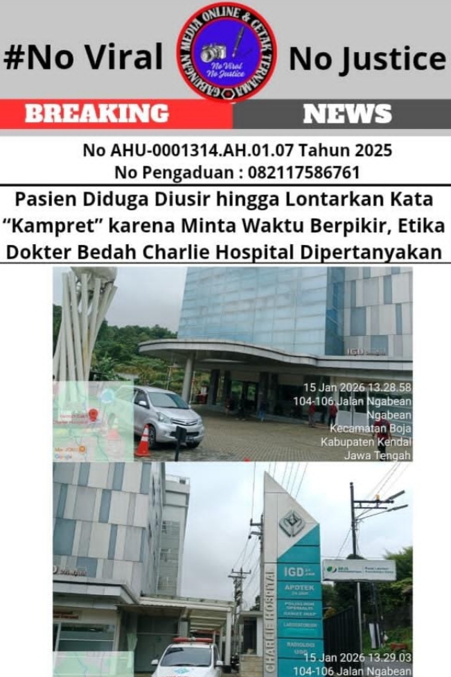Tegarnews.co.id-Kendal, 15 Januari 2026 (GMOCT)| Seorang pasien perempuan mengaku mengalami perlakuan tidak menyenangkan saat menjalani pelayanan kesehatan di Charlie Hospital, yang beralamat di Jl. Ngabean, Gowok, Kecamatan Boja, Kabupaten Kendal, Jawa Tengah. Informasi ini diperoleh GMOCT Gabungan Media Online dan Cetak Ternama dari media online Radarnet yang tergabung di dalamnya.