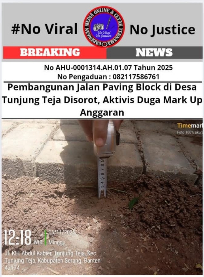 Tegarnews.co.id-Serang, 24 November 2025 (GMOCT)| Pembangunan jalan desa dengan perkerasan paving block di Kp. Cimanik RT 013/003, Desa Tunjung Teja, Kecamatan Tunjung Teja, Kabupaten Serang, menjadi sorotan aktivis Keluarga Masyarakat Serang (KAMARANG), Ahmad Saepi. Proyek yang menggunakan dana dari APBDes 2025 ini dinilai memiliki anggaran yang terlalu mahal.