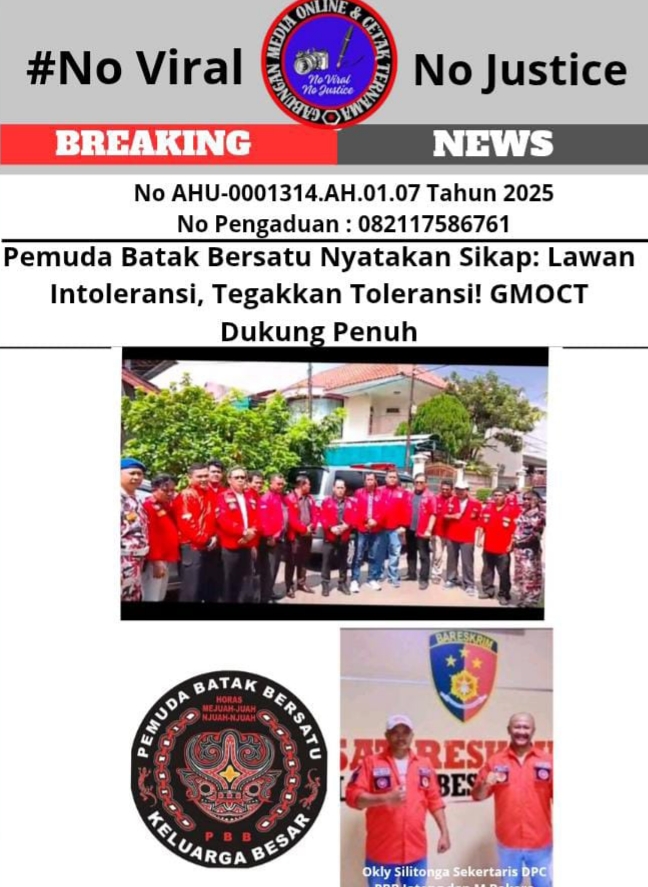 Tegarnews.co.id-Jakarta, 31 Juli 2025| (GMOCT)-Di tengah meningkatnya tindakan intoleransi di berbagai wilayah Indonesia, organisasi Pemuda Batak Bersatu (PBB) menyatakan sikap tegas: menolak segala bentuk intoleransi dan berkomitmen untuk tegakkan toleransi. Organisasi ini menegaskan bahwa mereka tidak akan tinggal diam ketika keadilan dan kebhinekaan diinjak-injak.