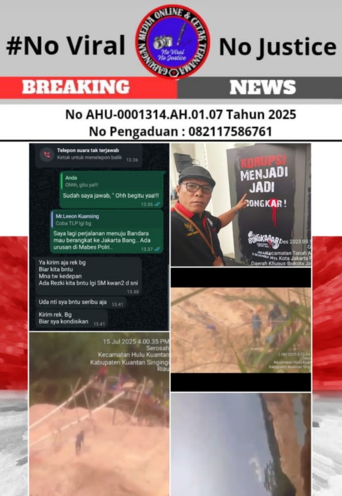 Diungkapkan Rahmad, keyakinannya bahwa apa yang dilakukan Kapolsek Hulu Kuantan hanya sekedar formalitas, karena pada Senin (06/10/2025) dirinya berusaha diiming-imingi sejumlah uang oleh seseorang yang sering disapa Leon, diduga merupakan “kaki tangan” dari Pemilik PETI.