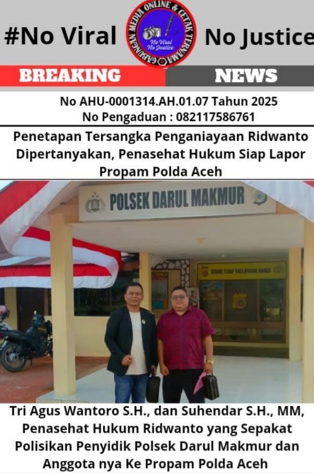 Tegarnews.co.id-Nagan Raya (GMOCT) 6 November 2025| Penetapan Ridwanto sebagai tersangka penganiayaan terhadap Muslem bin Syamaun, yang diduga melanggar Pasal 351 Kitab Undang-Undang Hukum Pidana (KUHP), oleh penyidik Polsek Darul Makmur kembali menuai sorotan. Penasihat hukum Ridwanto dari Kantor Hukum Adil Bangsa Yustisia mempertanyakan dasar penetapan tersebut. Kamis, 6 November 2025.