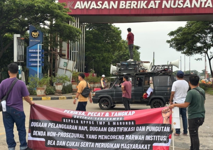“Kami tegas menyatakan sikap dan mendesak agar Setiaji Tenggamus diperiksa dan dicopot atas dugaan sejumlah pelanggaran yakni pelanggaran Ham, dugaan gratifikasi serta pungutan denda non prosedural yang tentunya jika dibiarkan akan mencoreng marwah institusi”, tegas Gokma Purba, Kordinator KMHN, di Kantor Bea Cukai Marunda, (11/2).