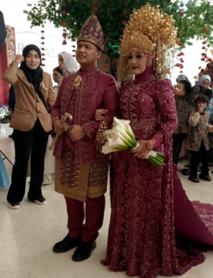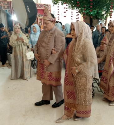 Kedua mempelai tampil anggun dalam busana adat Palembang bernuansa merah maroon. Momen haru terjadi saat prosesi sungkeman kepada orang tua dan keluarga, di mana keduanya tak kuasa menahan air mata.