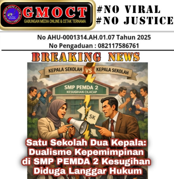 Agung Sulistio selaku Ketua Umum Gabungan Media Online dan Cetak Ternama (GMOCT) sekaligus Pimpinan Redaksi Sahabat Bhayangkara Indonesia (Kabarsbi.com) secara tegas menyoroti fenomena “satu sekolah dua kepala sekolah” yang terjadi di SMP PEMDA 2 Kesugihan Cilacap. Ia menilai kondisi tersebut bukan sekadar konflik internal yayasan, melainkan persoalan serius yang menyangkut kepastian hukum, tata kelola pendidikan, dan stabilitas proses belajar mengajar. Menurutnya, apabila dualisme ini dibiarkan tanpa tindakan tegas dari instansi terkait, maka akan mencederai prinsip profesionalisme pendidikan serta berpotensi merugikan peserta didik.