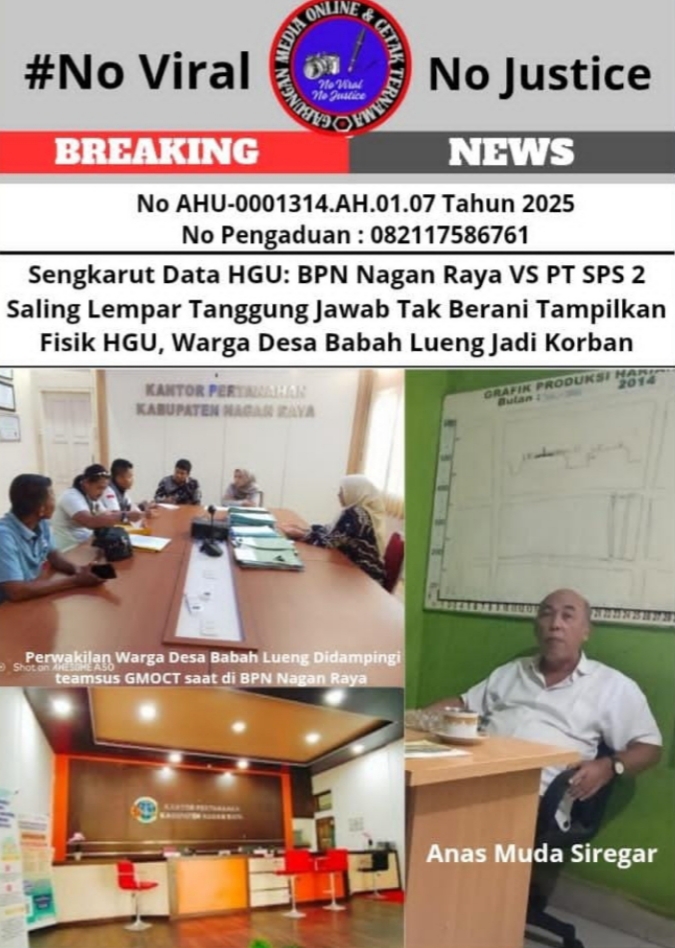 Tegarnews.co.id-Nagan Raya, Aceh (GMOCT) 12 Oktober 2025| Polemik terkait keterbukaan informasi Hak Guna Usaha (HGU) kembali mencuat di Nagan Raya, Aceh, setelah PT SPS 2 Agrina dan Badan Pertanahan Nasional (BPN) setempat terlibat saling lempar tanggung jawab untuk memperlihatkan bukti fisik ijin HGU yang diklaim oleh PT SPS 2 Agrina untuk dijadikan dasar melaporkan dua warga Desa Babah Lueng. Konflik ini berdampak langsung pada warga Desa Babah Lueng yang kini terancam kriminalisasi.
