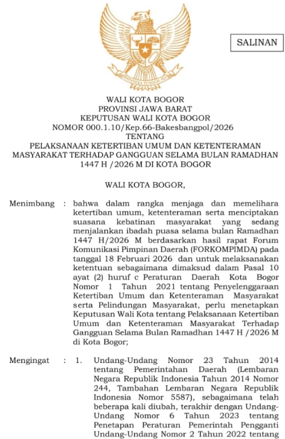 Rapat yang dihadiri unsur pemerintah daerah, TNI, Polri, dan aparat penegak hukum tersebut menghasilkan sejumlah kesepakatan yang kemudian dituangkan dalam Keputusan Wali Kota Bogor Nomor 000.1.10/Kep.66-Bakesbangpol/2026.