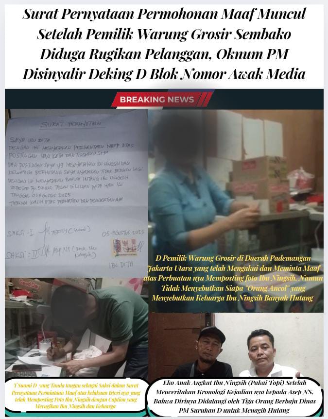 Tegarnews.co.id-Jakarta Utara, 7 Agustus 2025| Sebuah surat pernyataan permohonan maaf muncul setelah seorang pemilik warung grosir sembako berinisial D diduga melakukan tindakan yang merugikan salah satu pelanggannya, Ibu Ningsih. Kejadian ini bermula ketika D membuat story WhatsApp yang memposting foto Ibu Ningsih bersama cucunya tanpa izin, disertai caption yang dianggap sangat merugikan korban dan keluarganya. Hal ini dipicu oleh keterlambatan pembayaran sisa belanja sebesar Rp 500.000. surat tersebut dibuat tanggal 5 Agustus 2025 di warung milik D dan T.