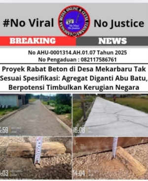 Tegarnews.co.id-Kabupaten Serang (GMOCT), 20 Desember 2025| Gabungan Media Online dan Cetak Ternama (GMOCT) mendapatkan informasi terkait kasus ini dari media online Katatribun yang tergabung di organisasi tersebut. Proyek Pembangunan jalan cor beton Desa Mekarbaru Kecamatan Petir, Kabupaten Serang, Banten, diduga tidak sesuai spesifikasi, pasalnya bangunan yang baru saja selesai sudah mengalami retakan halilintar di beberapa […]