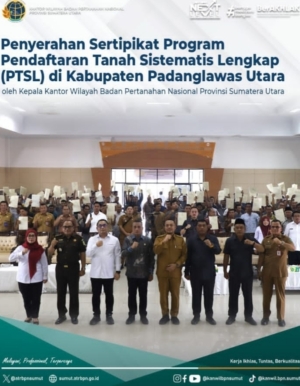 Tegarnews.co.id-Padanglawas Utara, 8 Oktober 2025| Kepala Kantor Wilayah Badan Pertanahan Nasional (BPN) Provinsi Sumatera Utara, Sri Pranoto, melakukan kunjungan kerja ke Kabupaten Padanglawas Utara dalam rangka penyerahan 400 sertipikat tanah hasil Program Pendaftaran Tanah Sistematis Lengkap (PTSL). Kegiatan penyerahan sertipikat elektronik tersebut berlangsung di Gedung Serbaguna Pemerintah Kabupaten Padanglawas Utara, pada Senin (7/10), dan dihadiri […]