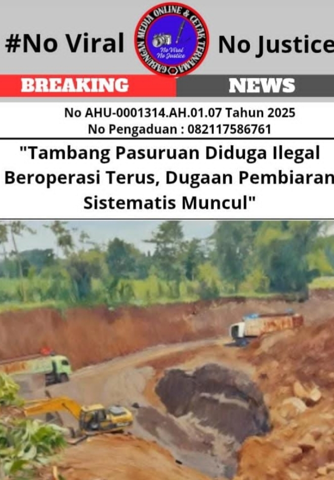 Tegarnews.co.id-Pasuruan, 18 Januari 2026 (GMOCT)| Aktivitas tambang pasir yang diduga ilegal milik TV Batu Alam Bekas Jaya di Dusun Dukuh Wetan, Desa Sumberejo, Kabupaten Pasuruan, semakin menguat sebagai potret buram penegakan hukum serta sektor pertambangan. Meski telah berulang kali diseret media dan memicu reaksi publik secara nasional, tambang tersebut tetap beroperasi tanpa tindakan tegas, memunculkan dugaan serius adanya pembiaran sistematis hingga pertumbuhan oknum tertentu.