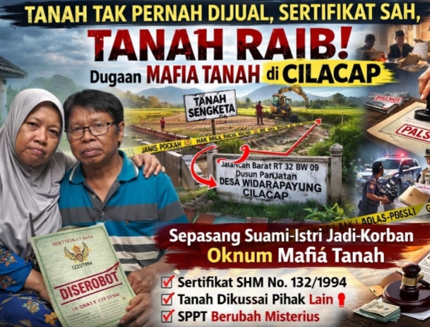 Tegarnews.co.id-Cilacap, 25 Februari 2026| Dugaan praktik mafia tanah kembali mencuat di Kabupaten Cilacap Jawa Tengah. Seorang warga mengaku kehilangan hak atas sebidang sawah seluas kurang lebih 1.800 meter persegi meski sertifikat hak milik (SHM) masih tercatat atas namanya.