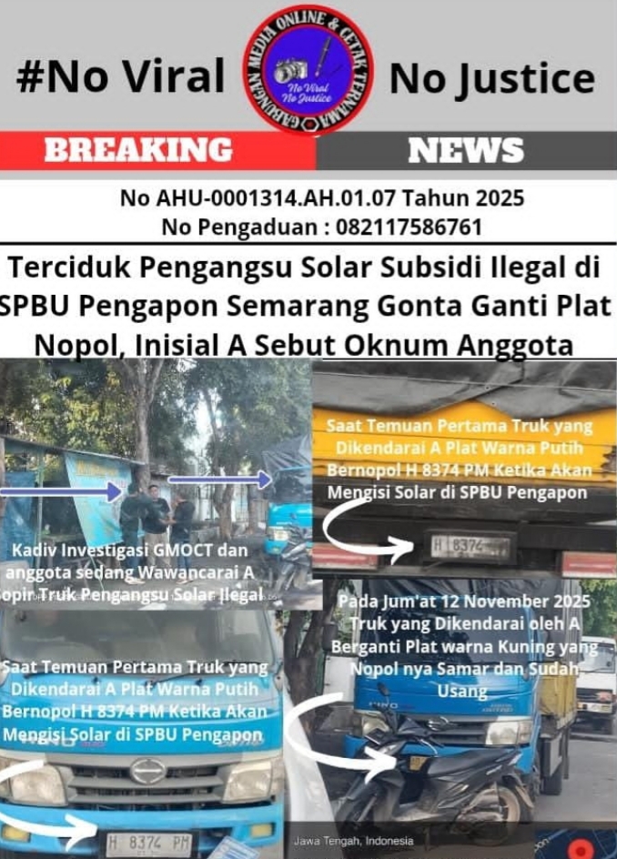 Penelitian yang dilakukan tim investigasi GMOCT menemukan praktik ilegal di SPBU 44.501.16 yang berada di Jl. Pengapon No.14, Kemijen, Kecamatan Semarang Timur, Jawa Tengah, pada hari Jumat (12/12/2025). Di lokasi tersebut, terpantau satu unit mobil truk tenda berwarna biru kuning dengan nopol H 8374 PM yang telah dimodifikasi tangkinya sedang mengisi solar subsidi dalam jumlah hingga ribuan liter.