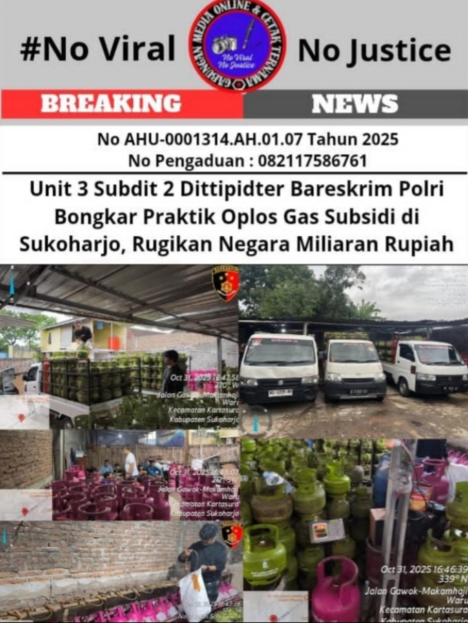 Tegarnews.co.id-Sukoharjo Jawa Tengah, 01 Nopember 2025| Unit 3 Subdit 2 Direktorat Tindak Pidana Tertentu (Dittipidter) Bareskrim Polri yang dipimpin oleh Kombespol Sardo MP Sibarani S.I.K., M.H., berhasil mengungkap praktik penyalahgunaan atau pengoplosan gas LPG subsidi 3 kg di sebuah gudang yang berlokasi di Desa Prampelan, Kelurahan Waru, Kecamatan Baki, Kabupaten Sukoharjo, Jawa Tengah. Penggerebekan dilakukan pada 31 Oktober 2025 sekitar pukul 16.00 WIB.