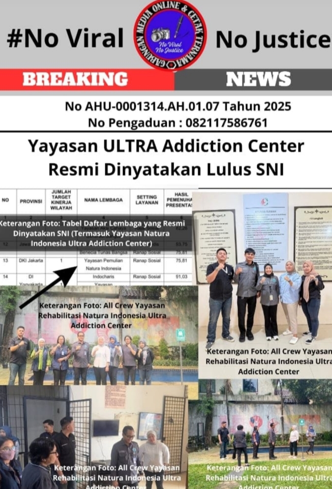 Tegarnews.co.id-jakarta, 11 Januari 2026 (GMOCT)| Kabar membanggakan datang dari Yayasan ULTRA Addiction Center. Lembaga rehabilitasi ini resmi dinyatakan lulus Standar Nasional Indonesia (SNI) setelah melalui rangkaian proses penilaian dan verifikasi yang ketat.